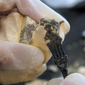 戴上白手套,将圆柱形土块表面用水润湿,拿起迷你版“洛阳铲”一点点铲下外围的泥土,再用小刷子扫去层层浮土……终于,一件迷你版“彩陶双连壶”露出真容。