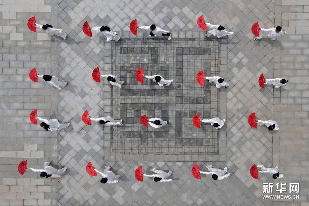 6月3日,河北邢台经济开发区沙河城镇中学学生在练习太极扇(无人机照片)。