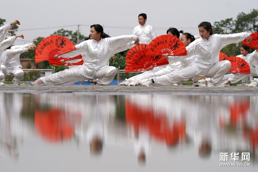 6月3日,河北邢台经济开发区沙河城镇中学学生在练习太极扇。新华社记者 骆学峰 摄