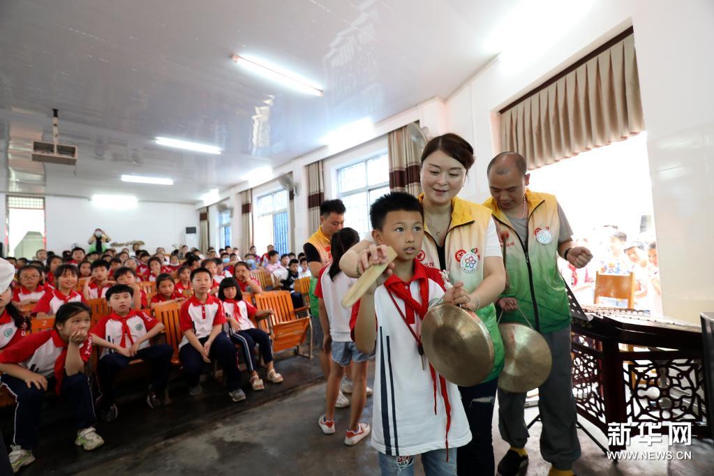 6月3日,资兴市鲤鱼江完全小学学生在体验使用花鼓戏表演所需的伴奏乐器。新华社发(李科 摄)