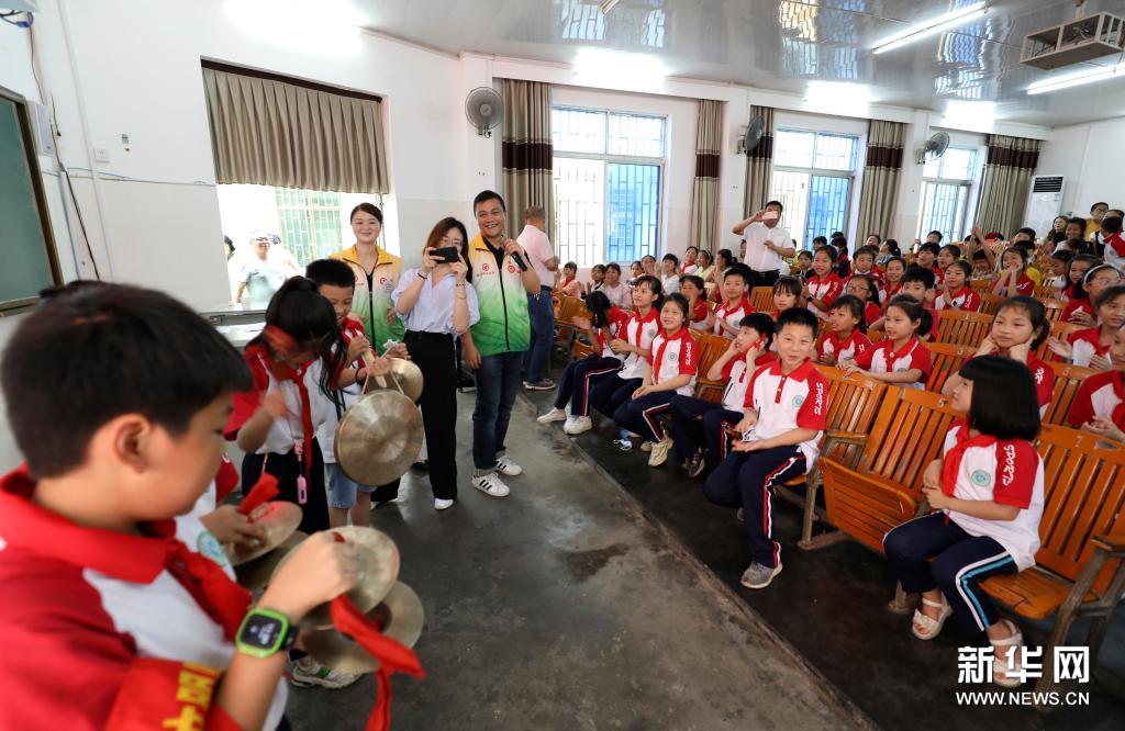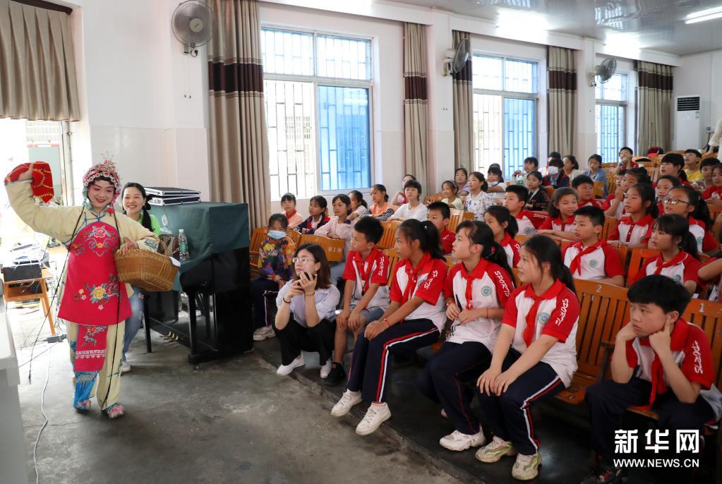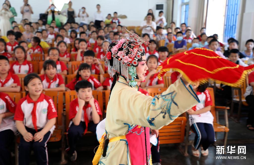 6月3日,演员在资兴市鲤鱼江完全小学为学生表演花鼓戏。新华社发(李科 摄)