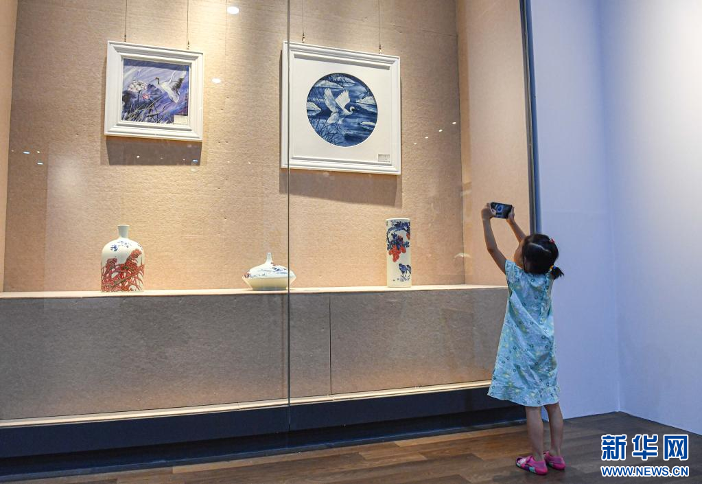 7月18日,一名小观众在位于海口的海南省博物馆拍摄景德镇陶瓷艺术作品展的展品。新华社记者 蒲晓旭 摄