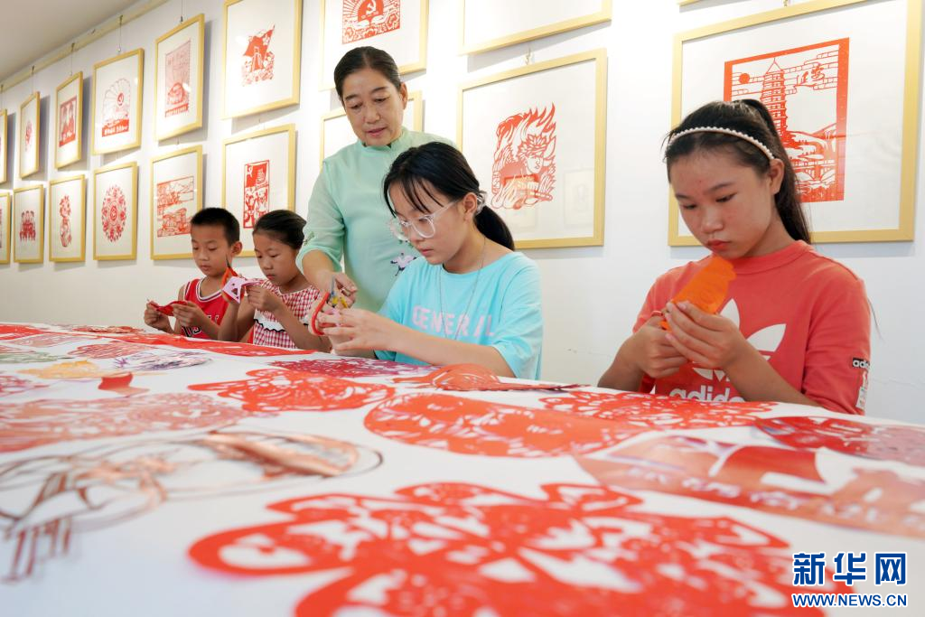 8月1日,在邢台市内丘县文化馆,小朋友在老师的指导下学习剪纸。新华社发(刘继东 摄)