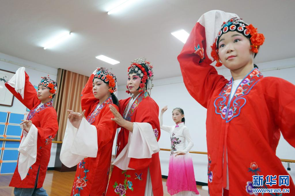8月1日,在邢台市内丘县文化馆,老师给小朋友指导戏曲动作。 新华社发(刘继东 摄)