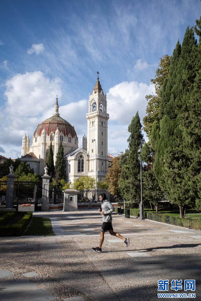 一名男子在西班牙马德里丽池公园内跑步(2020年10月4日摄)。 新华社记者 孟鼎博 摄