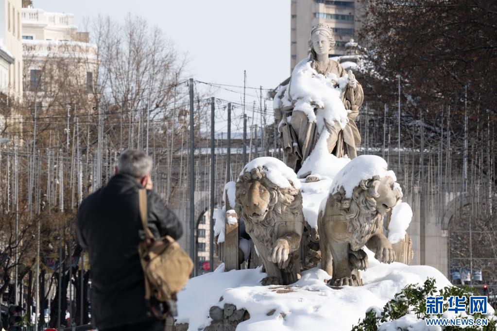 这是1月10日在西班牙马德里拍摄的位于普拉多大道的大地女神喷泉(又称丰收女神喷泉)。 新华社记者 孟鼎博 摄