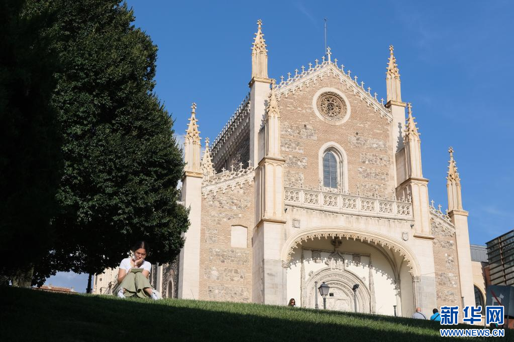 一名女子在西班牙马德里位于普拉多大道和丽池公园之间的圣热罗尼莫堂前写生(7月31日摄)。 新华社记者 孟鼎博 摄