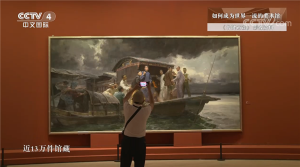 我们看着他,他也在看着我们,这是艺术跨越时空的力量,在7月的中国美术馆,《伟大征程 时代画卷》用它特有的方式,描绘着建党百年的中国故事,400余件美术作品,如同一个个历史剪影,让美术馆成为感知峥嵘岁月,展望未来征程的交汇点。一层圆厅的中央,油画《启航—中央一大会议》再现了中共一大南湖会议登船启航时的历史瞬间,用画笔定格“红船精神”。