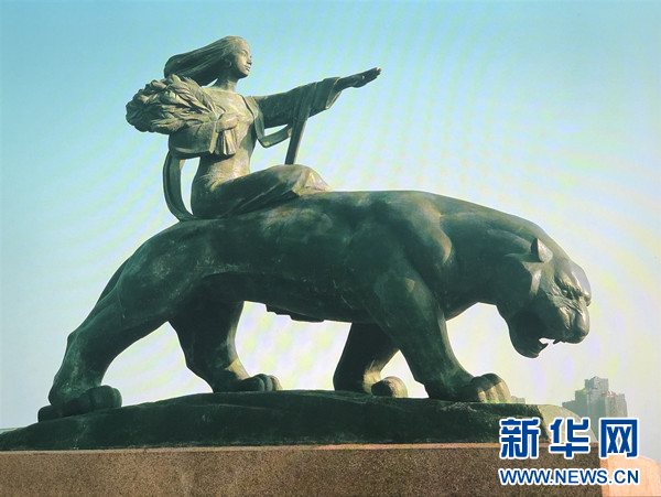 作品说明:作品刻画一位伏虎少女,仿佛置身在繁星点点的夜空下,身下被驯服的猛兽寓意着人类所征服的战争、贫困等一切邪恶;柔美的少女则是和平美好的化身,她平举左手指向远方,即是在驯服邪恶,又是在为人类指明和平美好的方向,右手捧着的麦穗,象征着人类通过劳作所获取的富足美满生活。