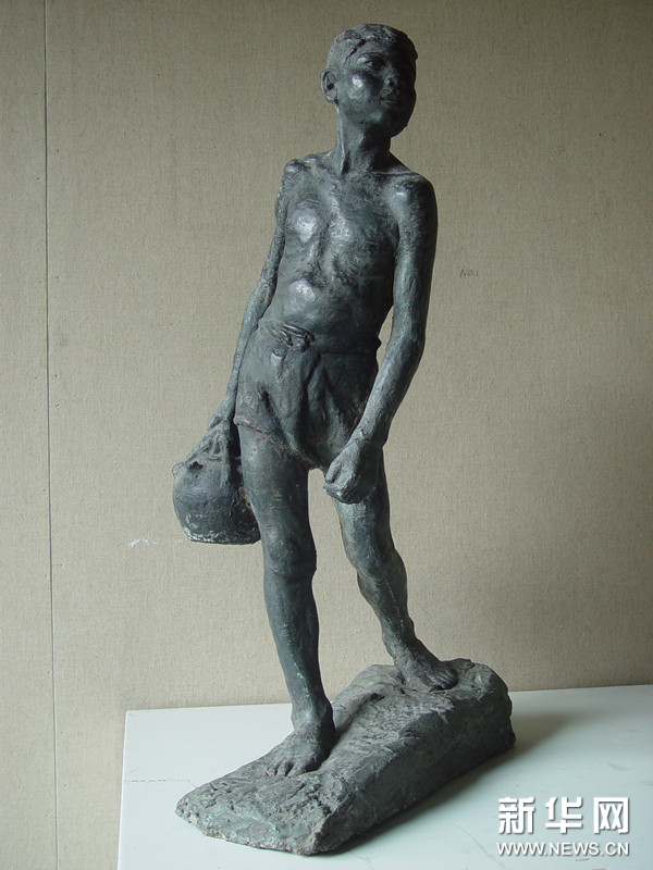 作品说明:《提水少年》采用现实主义创作手法,塑造了一位提水的少年,身体扭动,上身后倾,右腿跨前,左腿殿后,抬头左顾,似在寻找劳作的父母。作品构图生动,结构正确,手法洗练,充满泥土气息,体现作者生活阅历,充分体现了上世纪五、六十年代雕塑创作风格与作者扎实的造型功底。