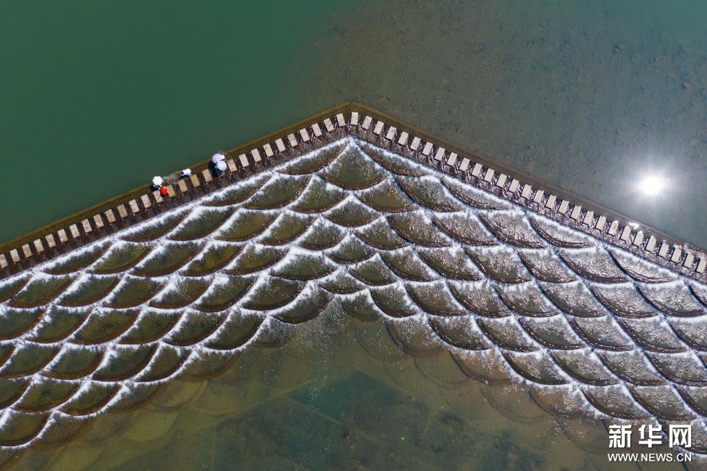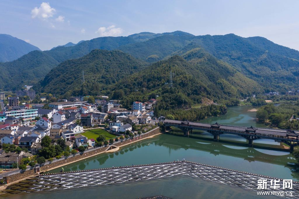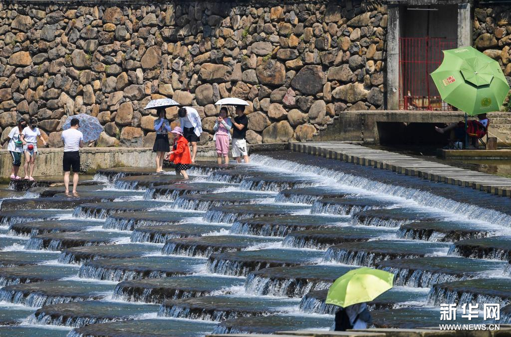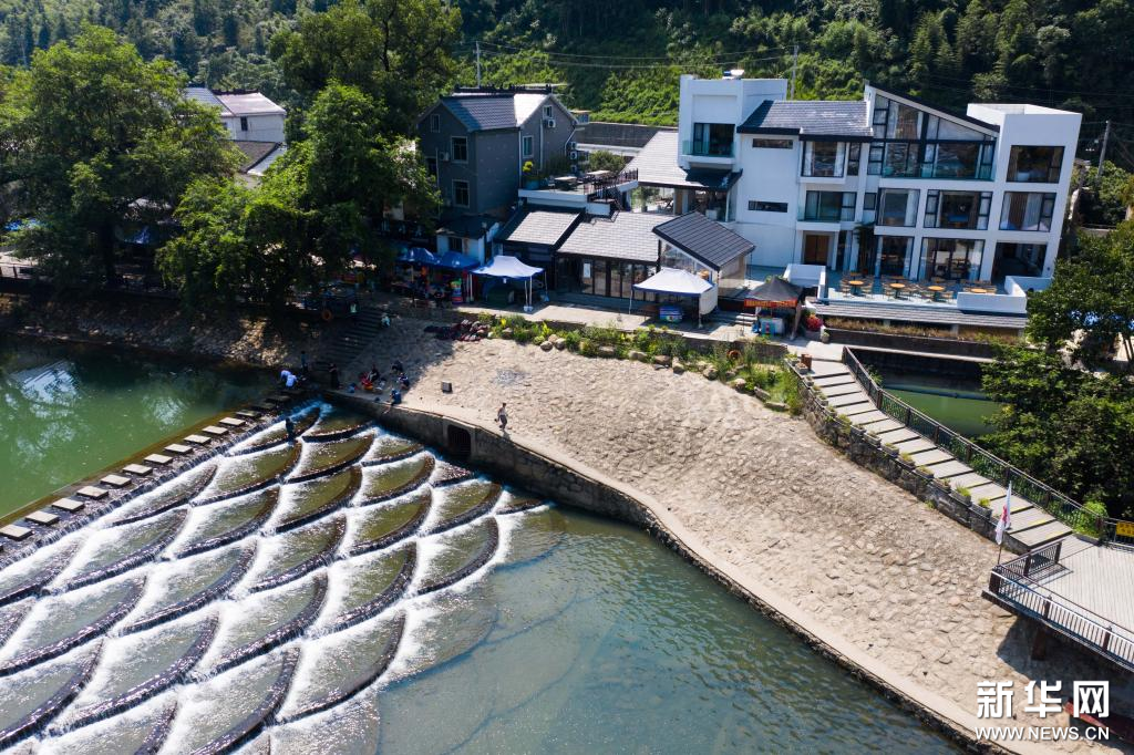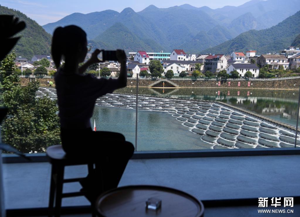 9月2日,游客在湖源乡龙鳞坝游玩。浙江省杭州市富阳区湖源乡龙鳞坝是位于湖源乡新一村和新绿村之间的一条生态堰坝,于2017年上半年完工。龙鳞坝全长170多米,从上到下一共13层,坝体上的每块“龙鳞”都是一个小的蓄水池,水流经过便会形成错落有致的弧形瀑布,与上游的廊桥构成了一幅美丽的山乡美景,吸引了众多的游客前来观赏体验。 龙鳞坝所在地湖源乡2020年共接待游客近100万人次。从2021年开始,湖源乡当地党委政府牵头分别成立了以民宿、餐饮、山货为主体的三个产业联盟,依托龙鳞坝的特色旅游资源,大力发展民宿、农家乐、山货等富民产业,通过联盟带动交流合作、客源互补,发展特色乡村旅游,带动当地百姓致富。新华社记者 徐昱 摄