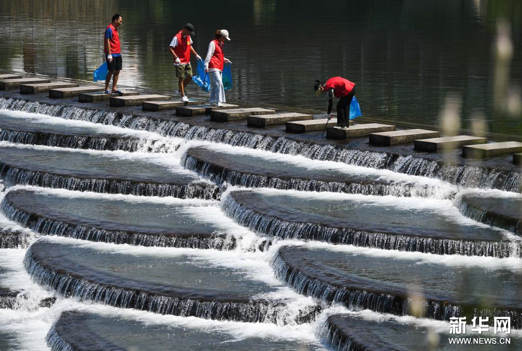 9月2日,青年党员志愿者在湖源乡龙鳞坝进行日常巡河,清理水面漂浮物。新华社记者 徐昱 摄