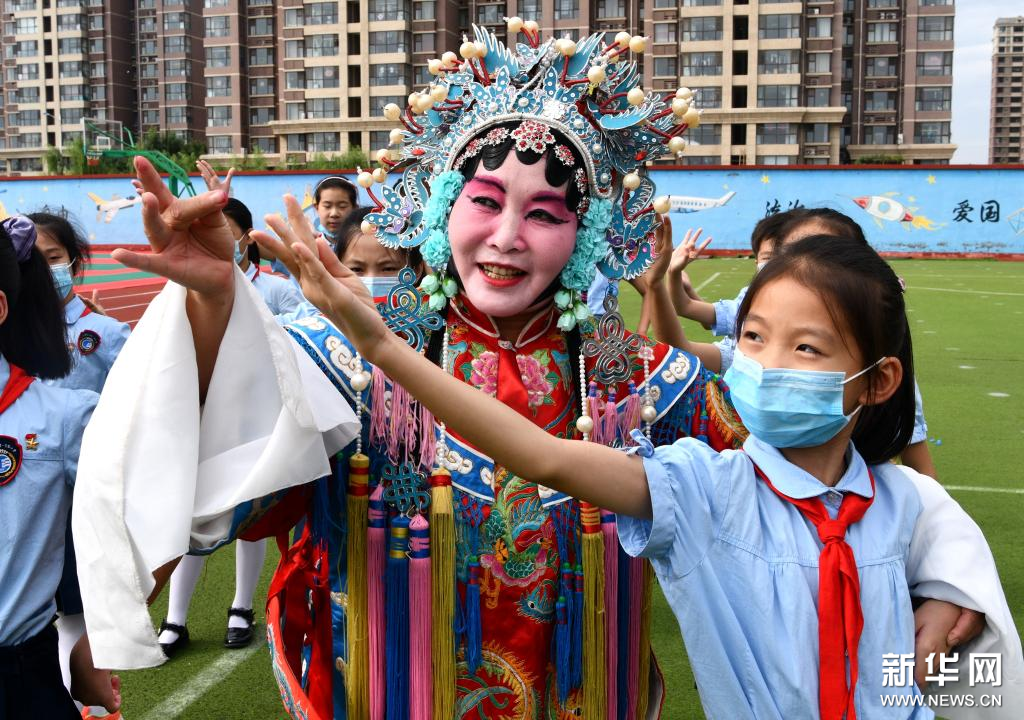 9月6日,在河北省石家庄市栾城区宏远路小学,丝弦演员在教学生们戏曲的基本动作。 当日,河北省石家庄市栾城区宏远路小学开展戏曲文化进校园活动,邀请丝弦演员到学校演出并传授基本知识,让孩子们感受戏曲的魅力。 新华社发(李明发 摄)