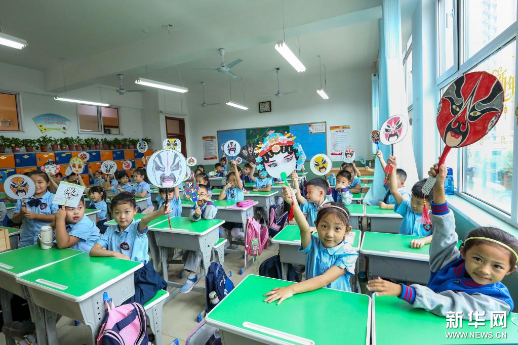9月6日,在河北省石家庄市栾城区宏远路小学,学生们在展示自己绘制的扇子脸谱。 新华社发(李明发 摄)