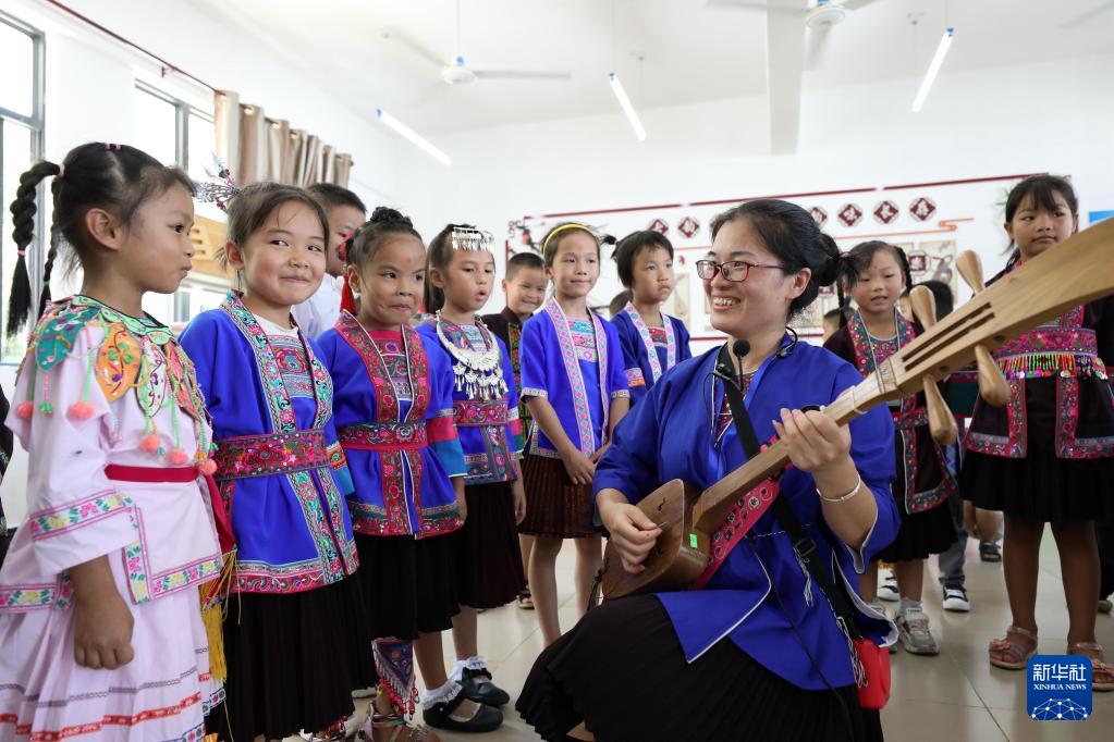 在广西柳州市三江侗族自治县古宜镇江川小学非遗课堂上,龙素华老师在教孩子们弹唱侗族琵琶歌(9月10日摄)。近年来,广西柳州市积极开展民族团结文化进校园活动,将苗族芦笙、侗族大歌等非遗文化引进中小学课堂,让学生在传承优秀中华文化的同时,接受民族团结进步教育,铸牢中华民族共同体意识。新华社发(龚普康 摄)