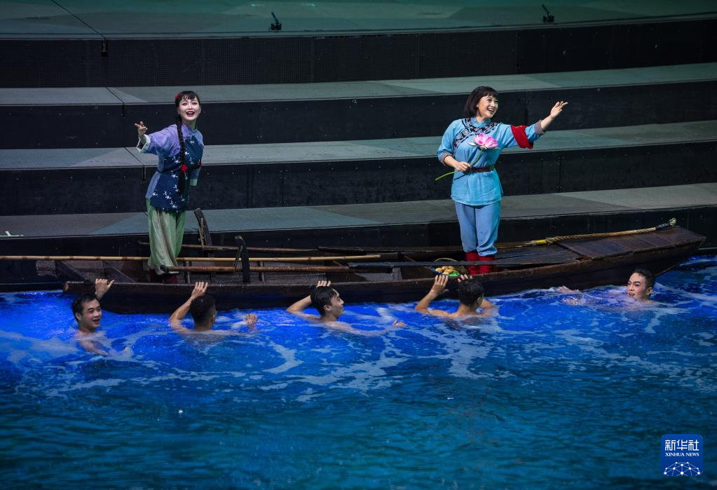 2021年9月25日,演员在演出歌剧《洪湖赤卫队》。 当日,由湖北省歌剧舞剧院创排的科技版《洪湖赤卫队》在武汉汉秀剧场首演。此次演出的版本将经典歌剧与高科技舞台结合,将“千里洪湖”实景呈现。