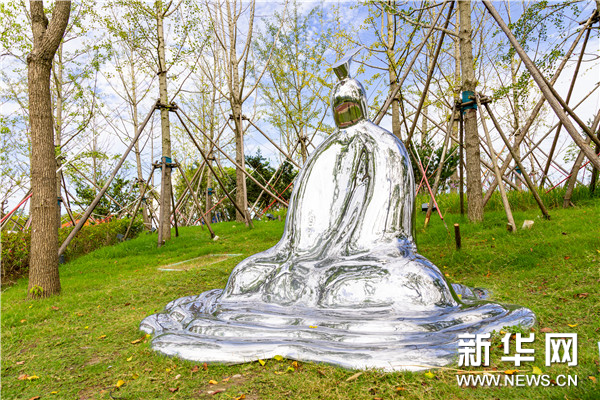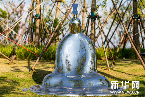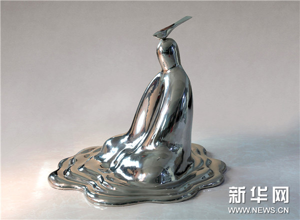 作品说明:《明月洗心》以象征性手法表现了人对生命意义的追寻,造型曲折的抛光面所反射的镜像使观众与作品之间相互映衬,一切都在观照中得以了解和释然。