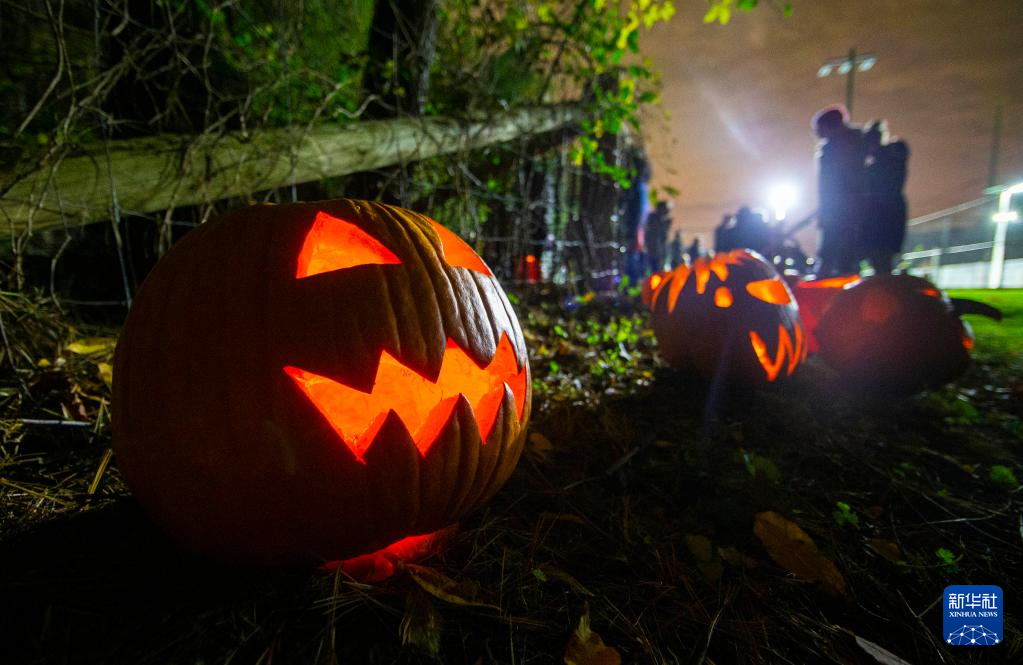 11月1日晚,人们在加拿大米西索加一家公园内参观点亮的南瓜灯。当地居民在入夜时分将在万圣节制作的南瓜灯带到公园并点亮展示,吸引了众多观众。新华社发(邹峥摄)