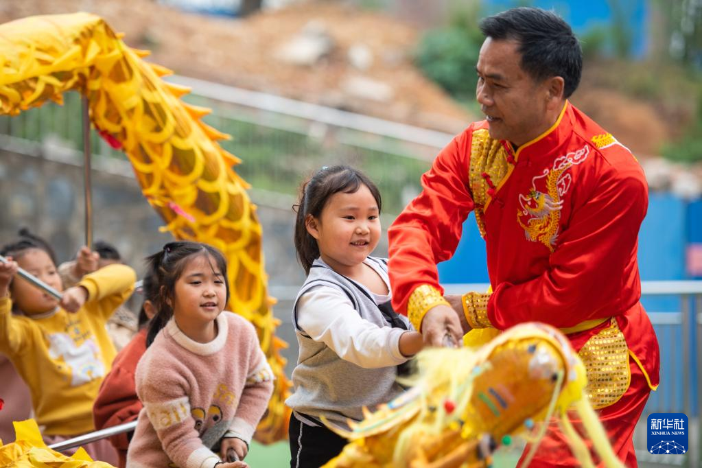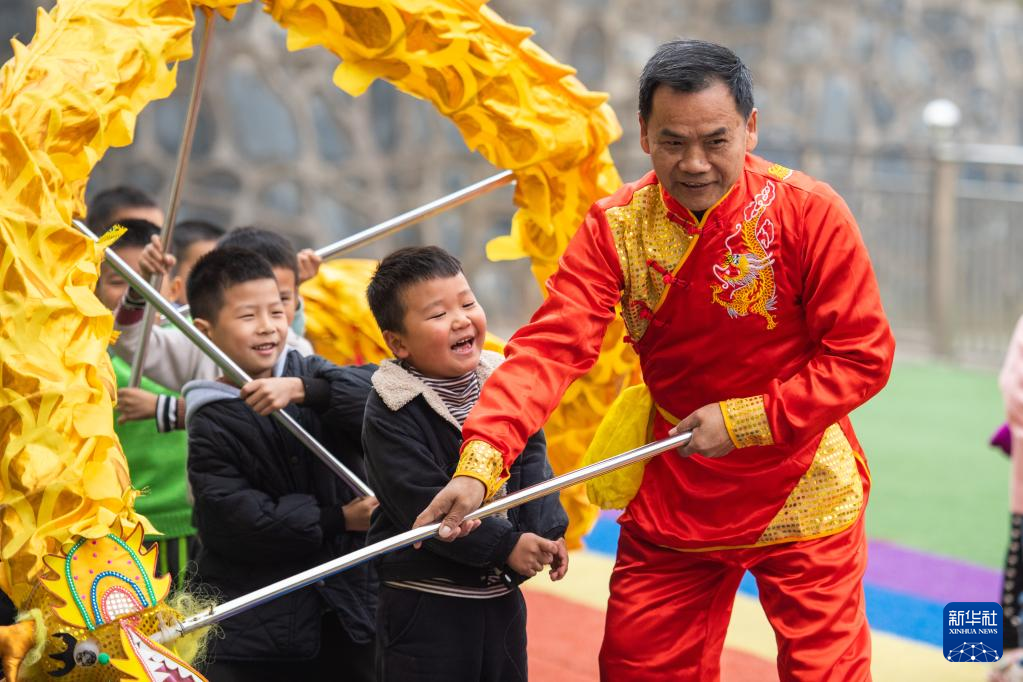 11月17日,在尧天坪镇幼儿园,龙狮艺人文麦秋(右一)带领学生练习舞龙。新华社记者 陈思汗 摄