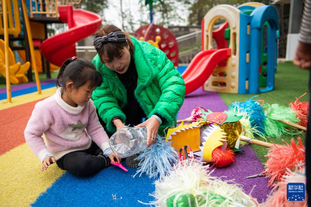 11月17日,在尧天坪镇幼儿园,老师指导学生手工制作舞龙道具。新华社记者 陈思汗 摄
