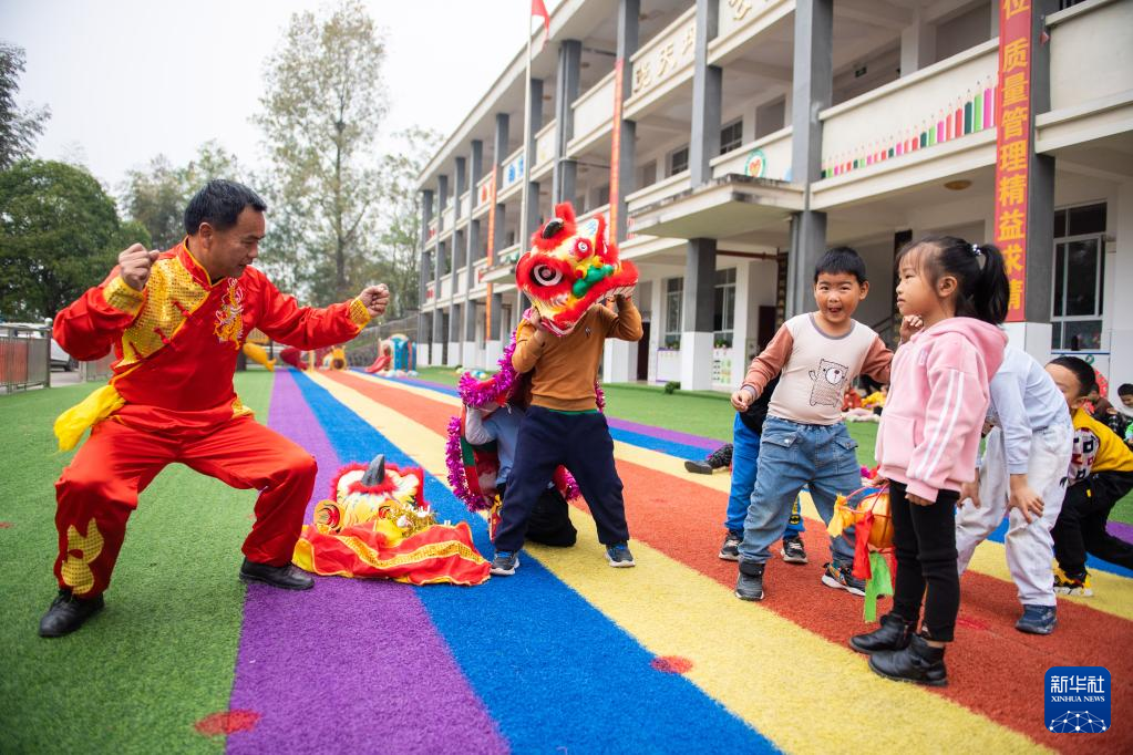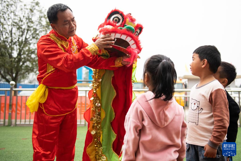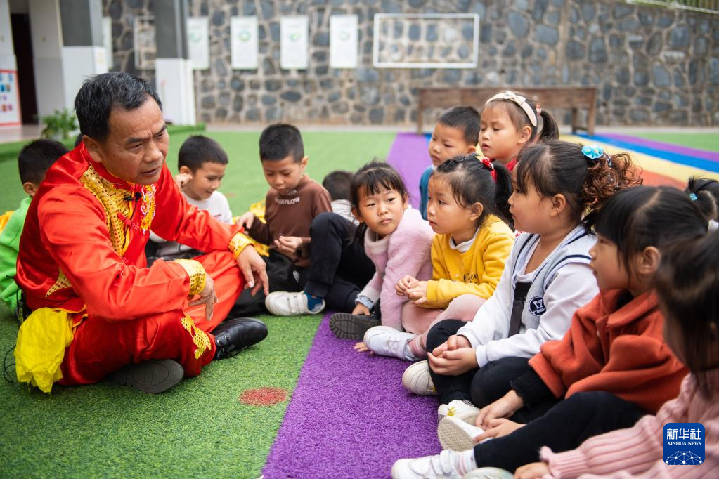 11月17日,在尧天坪镇幼儿园,龙狮艺人文麦秋给学生上非遗课。新华社记者 陈思汗 摄