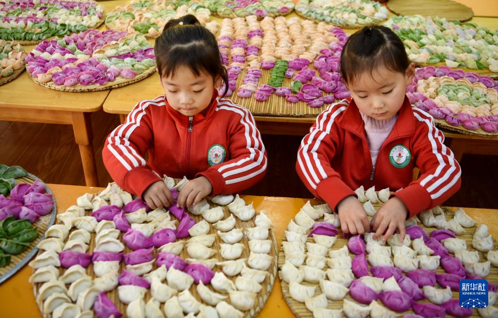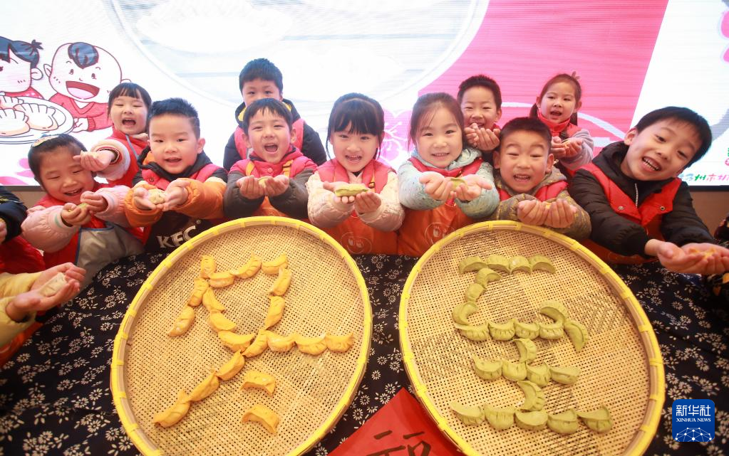 12月21日,山东省淄博市沂源县悦庄幼儿园的小朋友用包好的饺子摆出“冬至”字样。