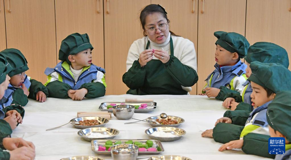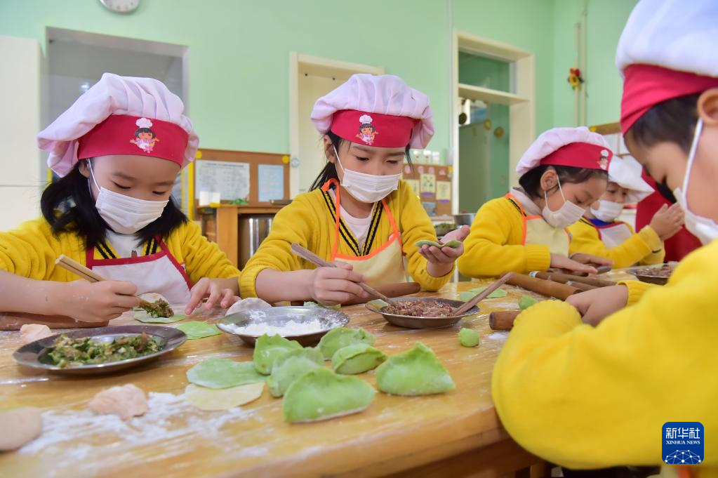 12月21日,在河北省石家庄市第三幼儿园,孩子们学包饺子。