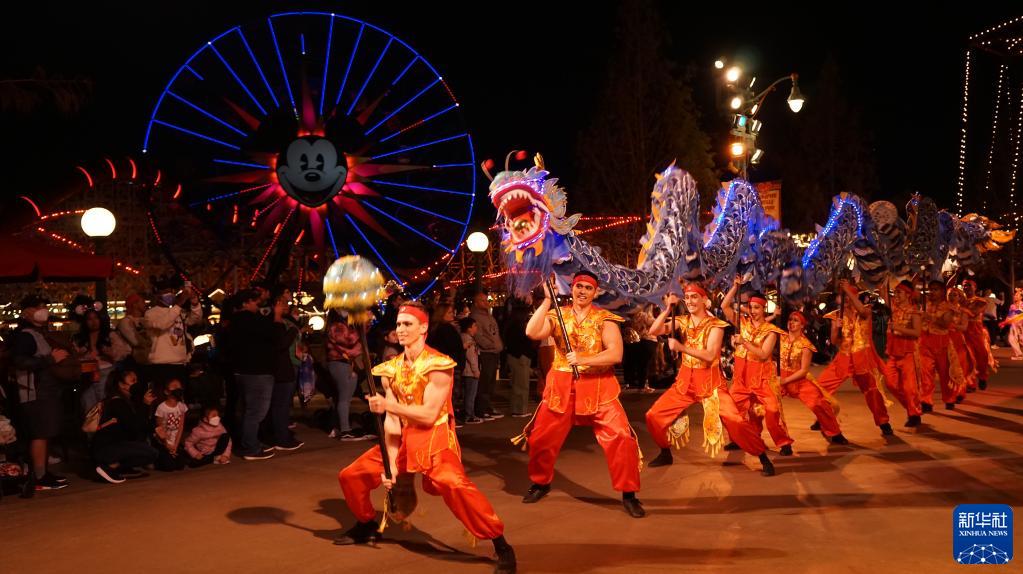 1月21日,在美国加利福尼亚州迪士尼冒险乐园,游客观看舞龙表演。新华社发(曾慧摄)