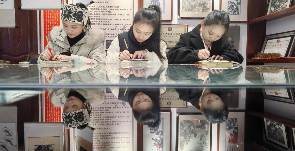 三名女孩子在泸溪县浦市古镇踏虎凿花大师工作室中创作。新华社记者赵众志摄
