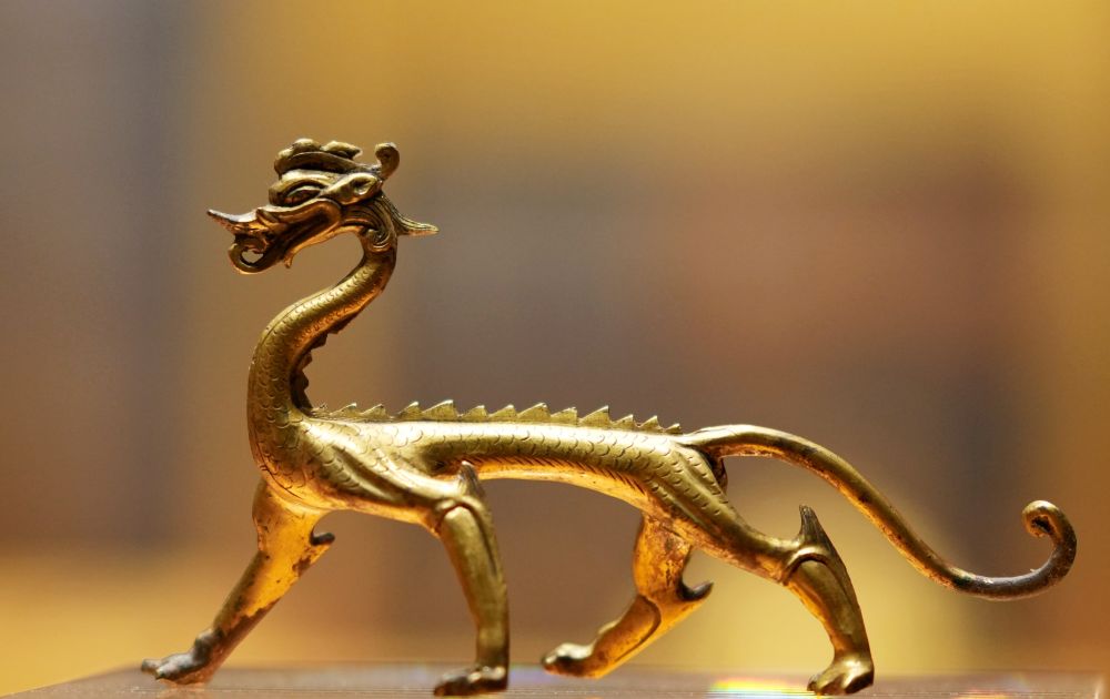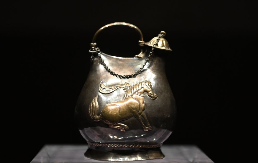 ↑陕西历史博物馆展出的唐代鎏金舞马衔杯纹银壶
