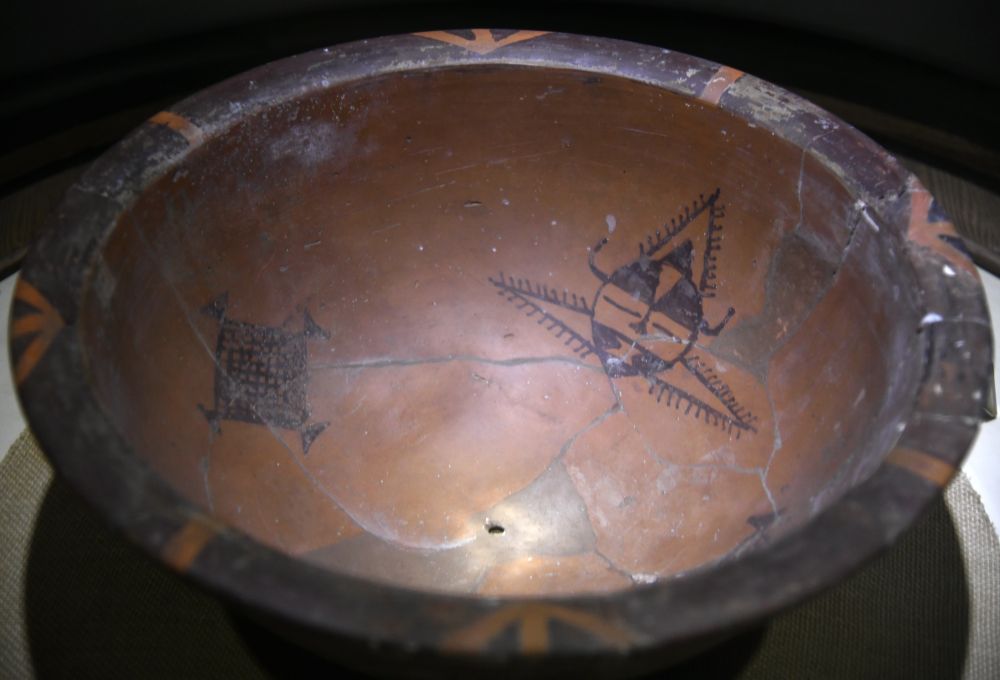 ↑西安半坡博物馆展出的人面网纹彩陶盆
