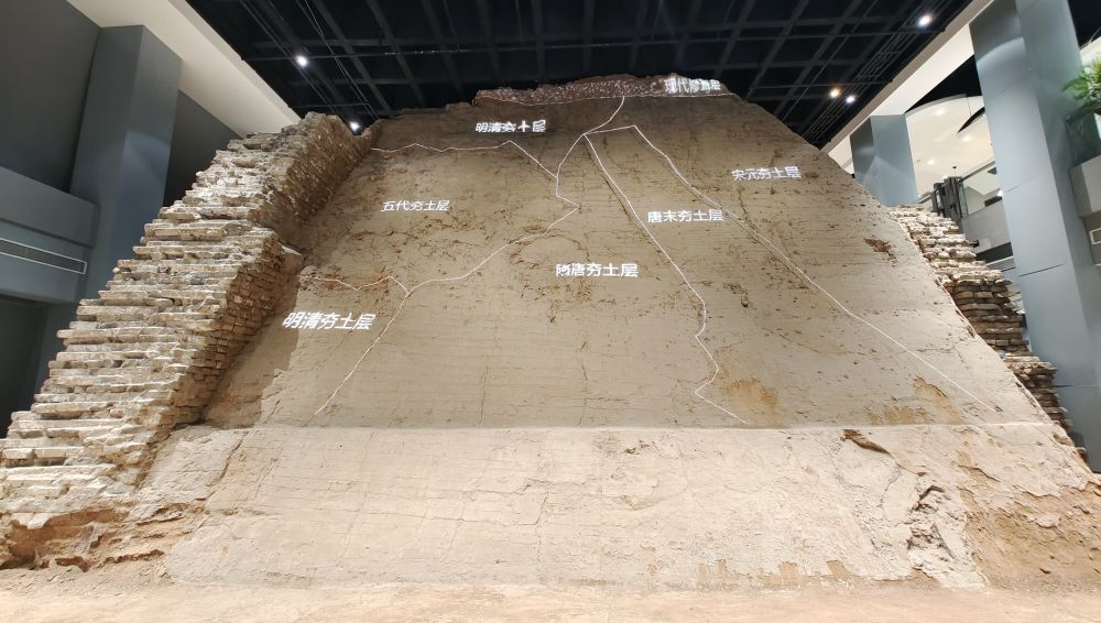 ↑西安唐皇城墙含光门遗址博物馆内展示的城墙断面遗址