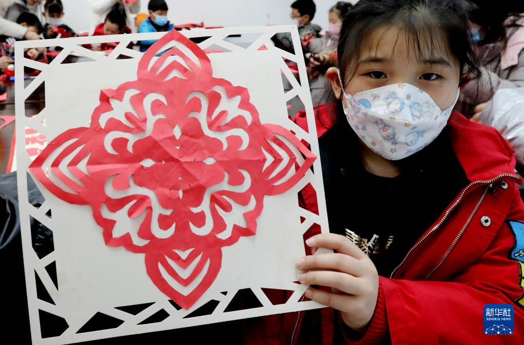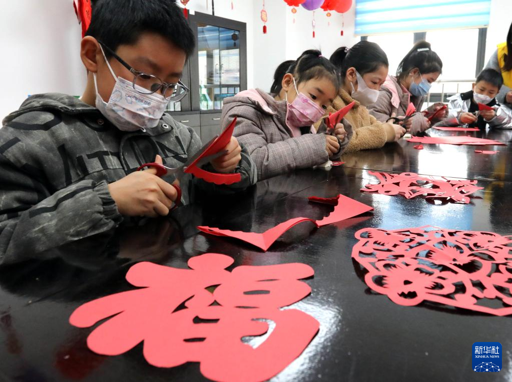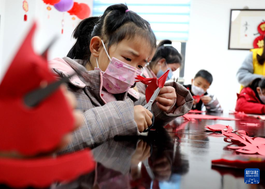 1月14日,在苏州市高新区狮山横塘街道青春社区文化活动室,孩子制作窗花。新华社发(杭兴微摄)