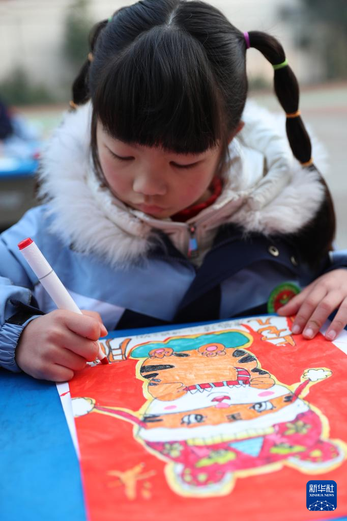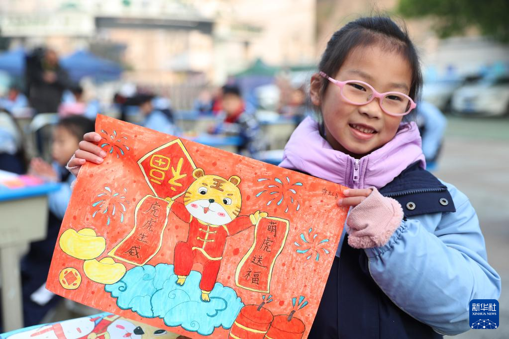 1月19日,四川省华蓥市双河第三小学校举行迎虎年主题活动,小朋友们用手中的画笔画出形态各异的“生肖虎”,迎接新春的到来。