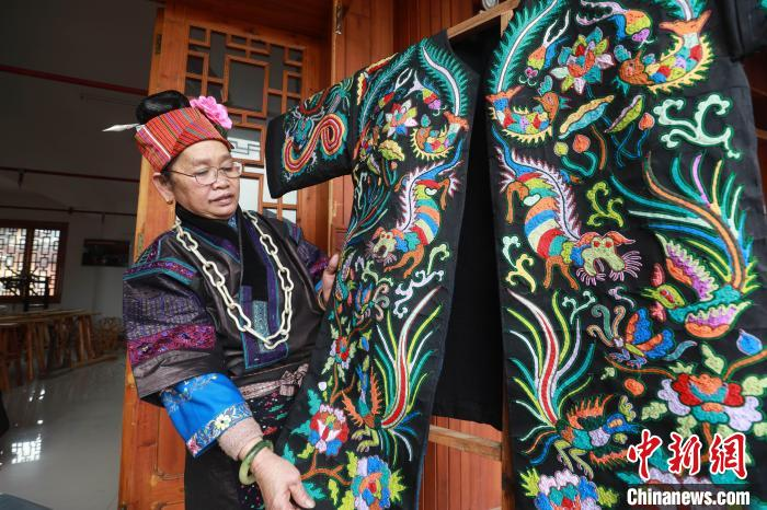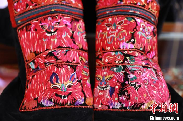 “订单一来,我先剪出花纹样板,然后交给绣娘依样刺绣。”姜文英说,除苗族剪纸外,虎形图腾经常被融入苗族孩童服饰刺绣创作中,取意虎威震四方,护佑孩童平安康健。