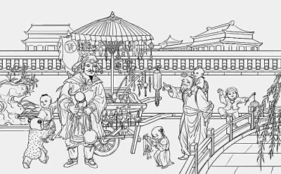 在礼盒外观上,团队参考了长轴年画《百子闹春》。百子闹春是传统文化中经典的祥瑞意象,团队据此设计了多个小童形象,或作揖贺岁、舞狮庆福,或绕膝玩耍、掌灯游岁,画风轻快而不失古雅。《明宪宗元宵行乐图》中的货郎担形象独具特色,团队在原画作的基础上,请插画师进行了二次设计创作,使人物造型、布局构图更加贴近现代年轻人的审美风格,由此便有了右侧的手稿。(记者李丹阳采访整理,受访者供图)