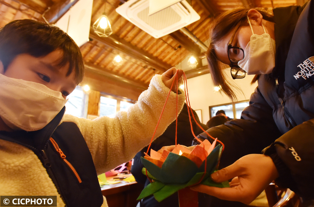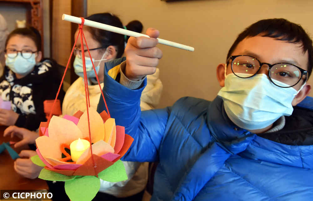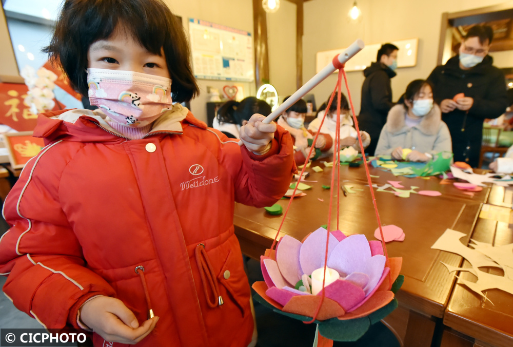2022年2月9日,小朋友在展示刚刚制作好的传统的民俗莲花灯。CICPHOTO/庄文斌 摄