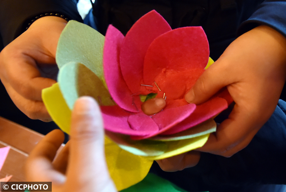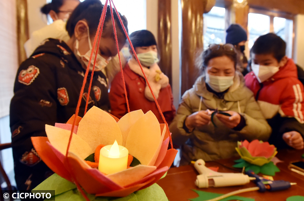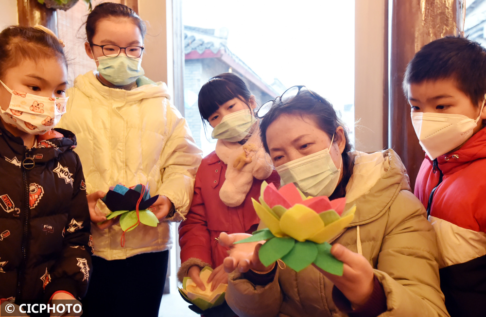 2022年2月9日,小朋友在江苏省扬州市古城仁丰里历史文化街区内,学习制作传统的民俗莲花灯。CICPHOTO/庄文斌 摄