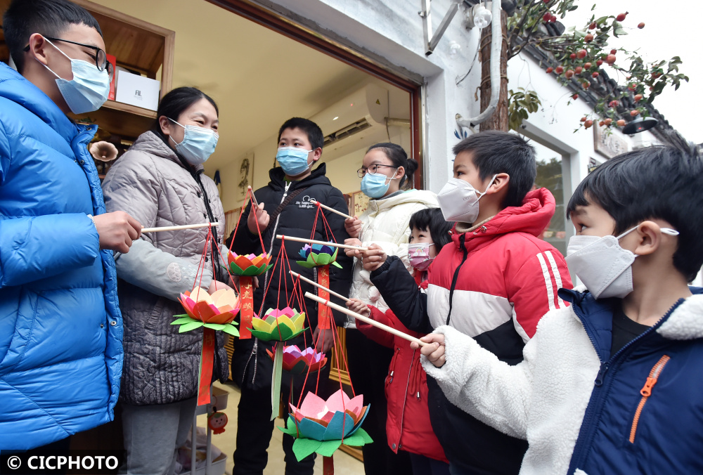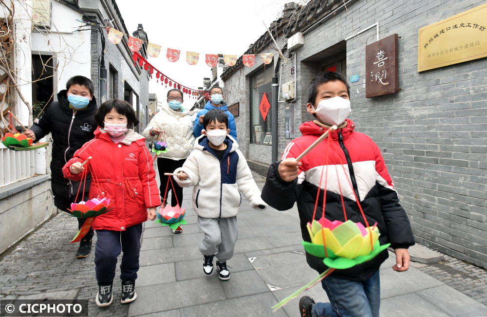 2022年2月9日,江苏省扬州市小朋友在扬州古城仁丰里历史文化街区内,将自己手工制作的传统民俗莲花灯赠送街区商户。CICPHOTO/庄文斌 摄