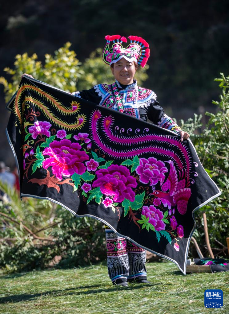 2月15日,一名彝族妇女在“赛装节”上展示刺绣作品。 新华社记者 陈欣波 摄