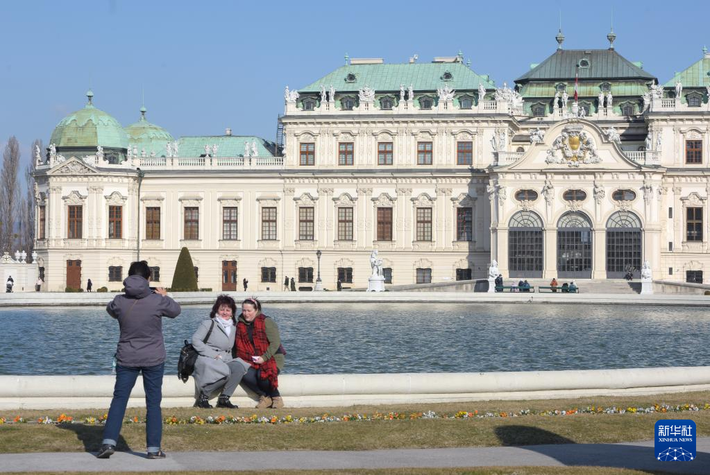 2月28日,游客在奥地利维也纳的上美景宫外留影。新华社记者 郭晨 摄