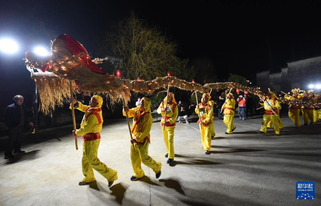 3月2日,在黄山市徽州区蜀源村,“舞草龙”队伍在村中巡游。