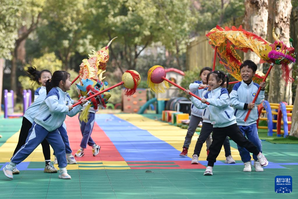 3月4日,江苏南京建邺区金地名京幼儿园的小朋友在表演舞龙。