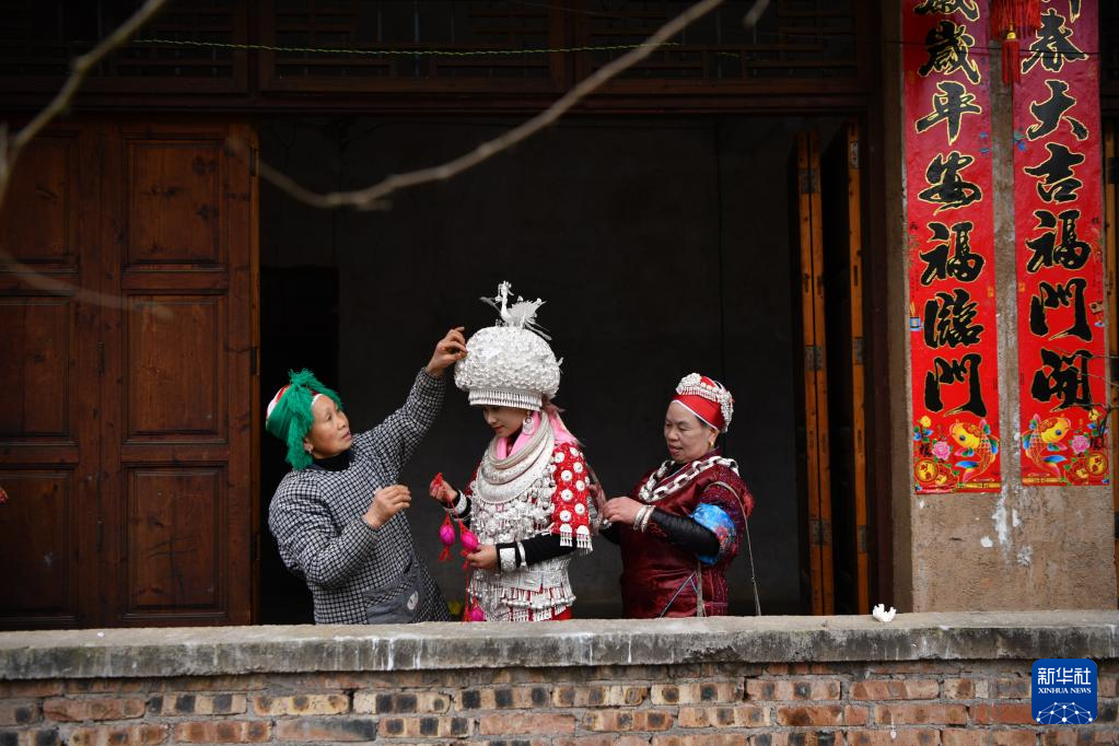 3月4日,在贵州省黔东南苗族侗族自治州黄平县谷陇镇岩英村,苗族同胞身着盛装准备参加二月二民俗活动。