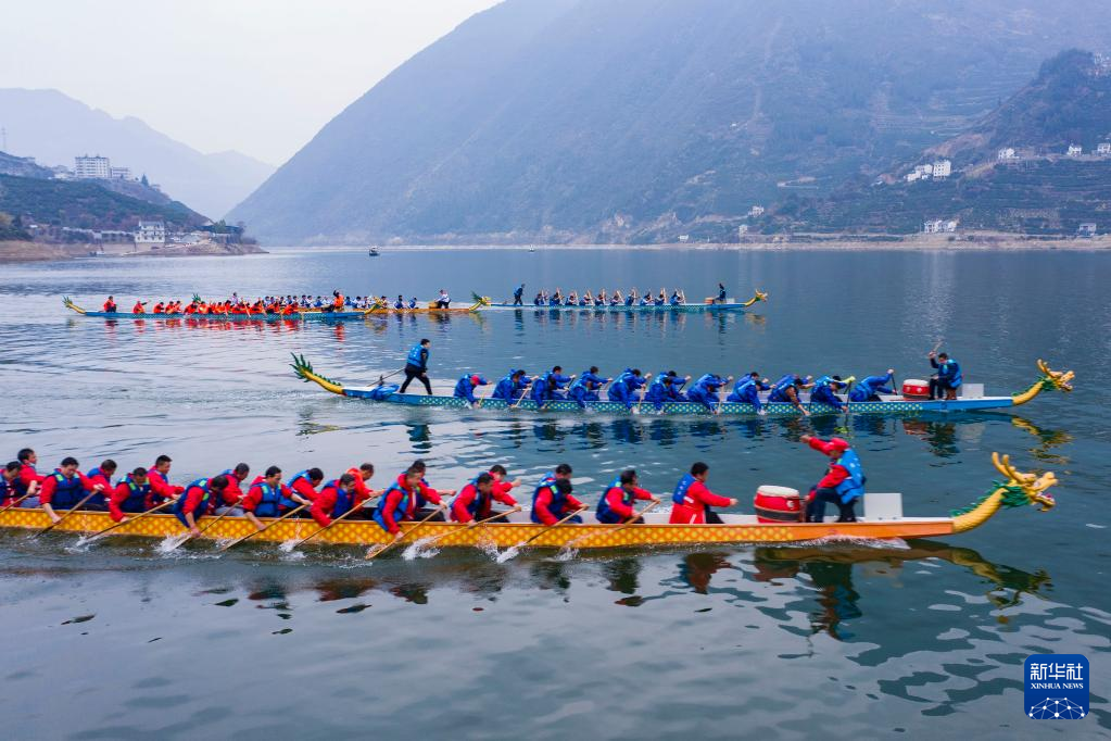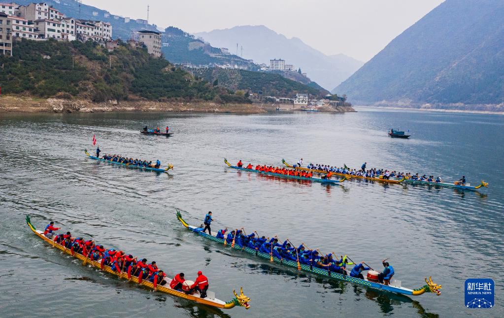 3月4日,参赛龙舟在湖北省宜昌市秭归县万古寺村香溪河畔奋勇竞渡(无人机照片)。