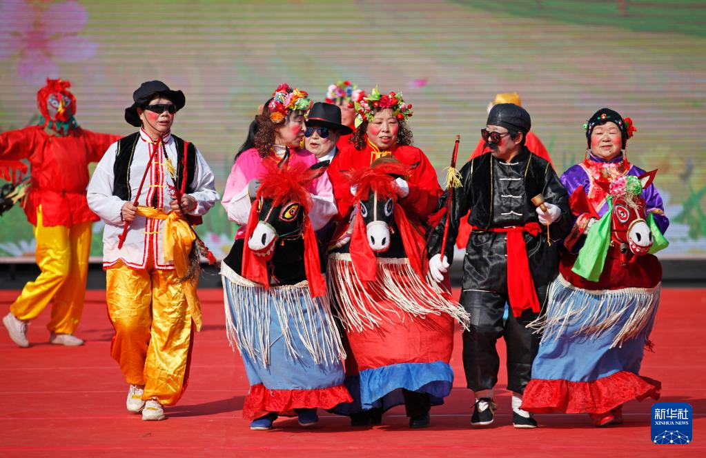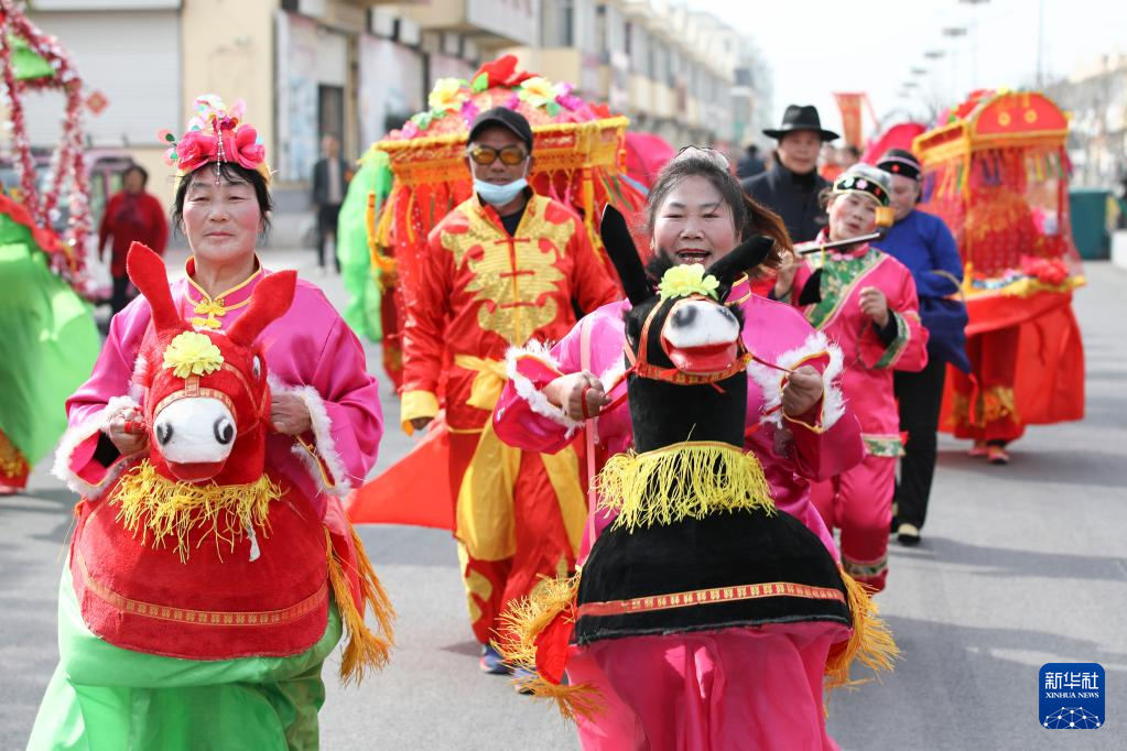 3月4日,在山西省临汾市襄汾县陶寺村,民间社火队在“二月二龙抬头社火节”网络直播活动中表演传统民俗节目《回娘家》。