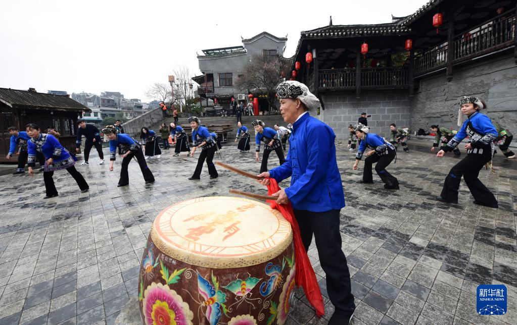 3月4日,在湖南省湘西土家族苗族自治州吉首市乾州古城,苗族同胞在表演调年舞。