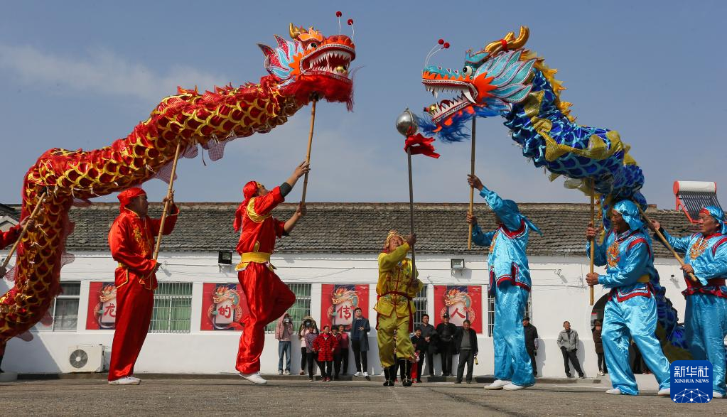 3月4日,在江苏镇江句容市郭庄镇芦亭村,村民在“二月二龙抬头”民俗表演活动中表演舞龙。