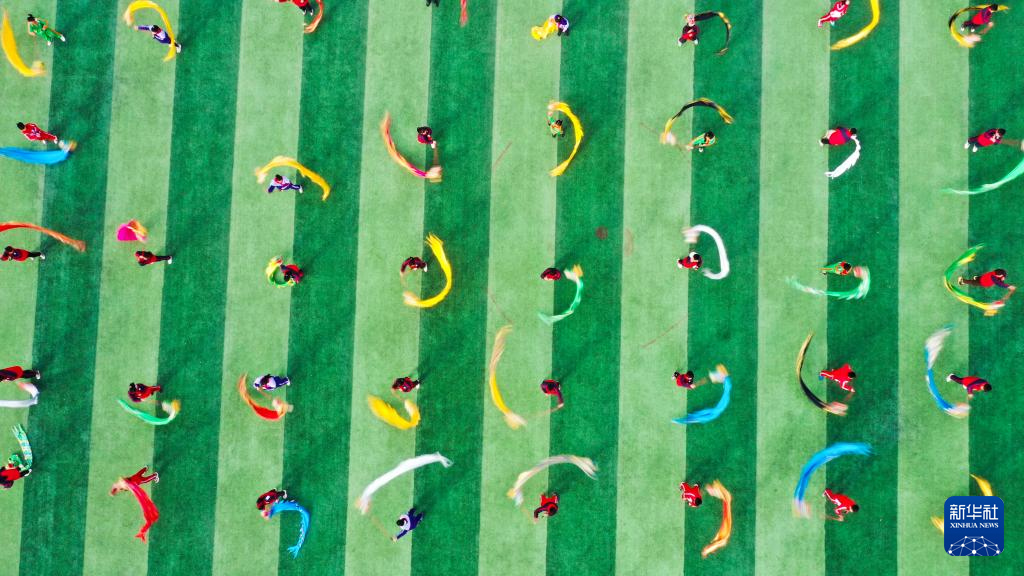 3月4日,河北省遵化市东旧寨镇梁屯中心小学的学生在表演舞龙民俗节目(无人机照片)。