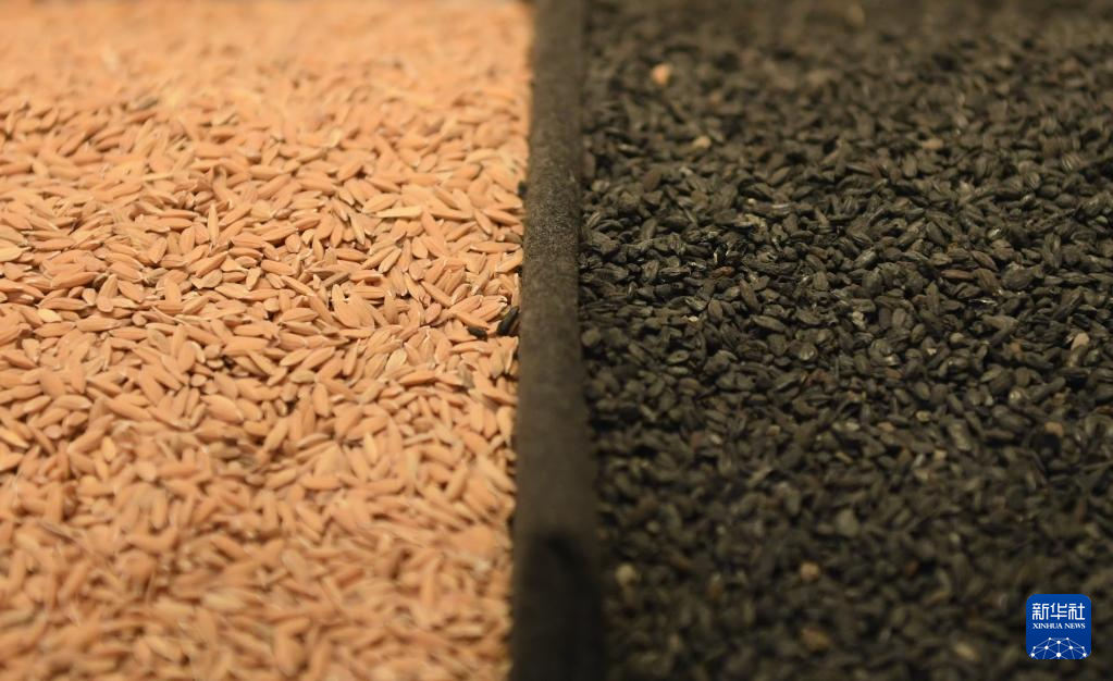 这是良渚博物院展示的现代稻谷和良渚遗址出土的炭化稻谷(右)的实物对比(3月2日摄)。新华社记者 翁忻旸 摄